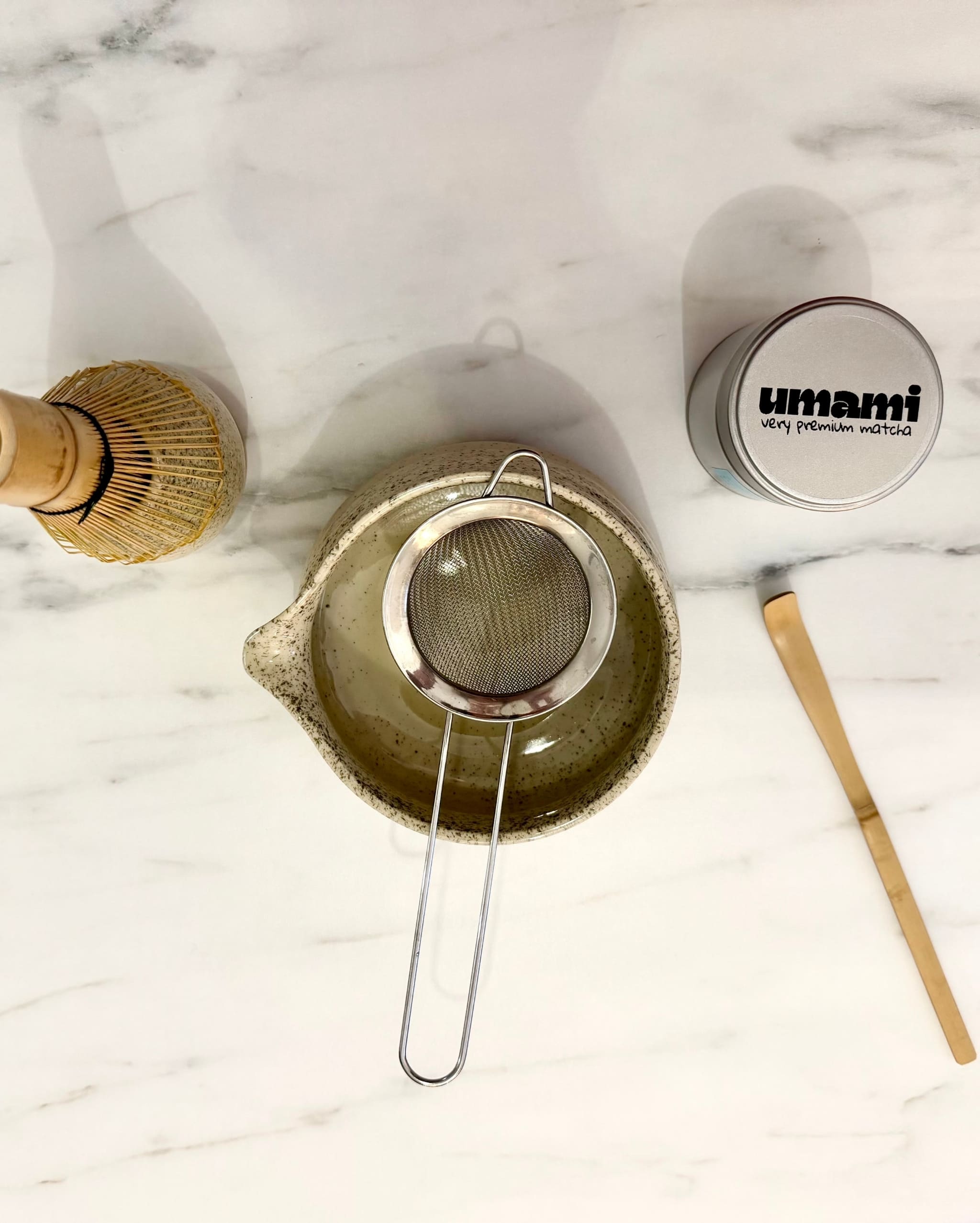 A legjobb élményhez használj bambusz seprűt, tálat és szitát – ezekkel lesz igazán habos, krémes és egyenletes a textúra. Az Umami Matcha eszközök mind japán hagyományok szerint készülnek.